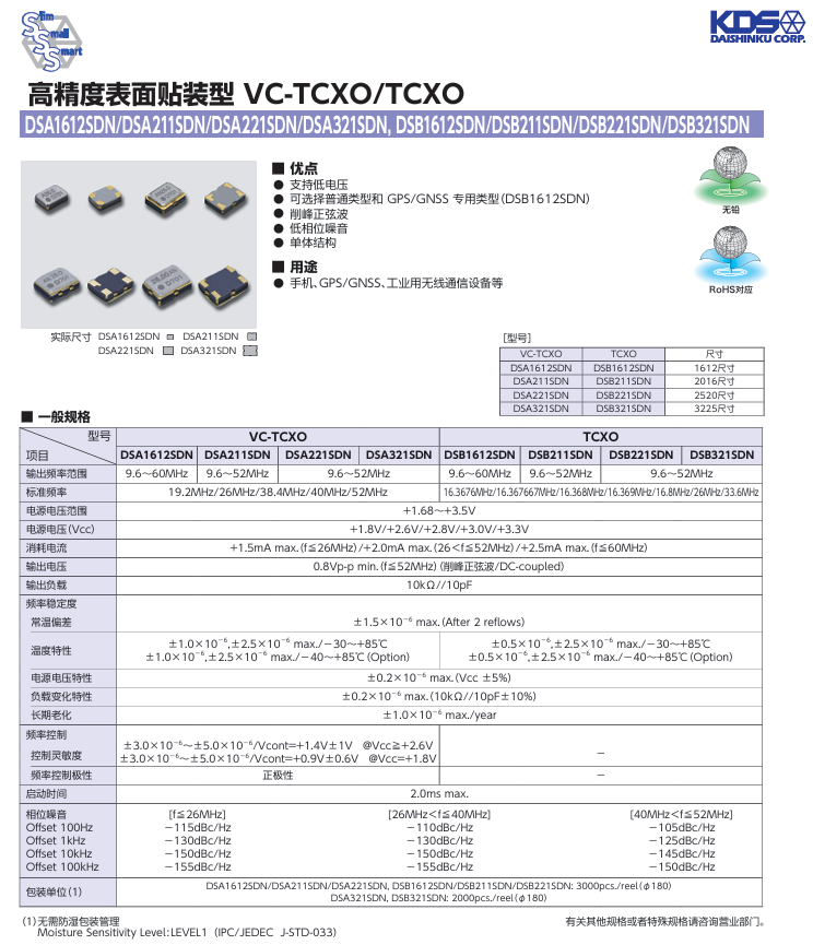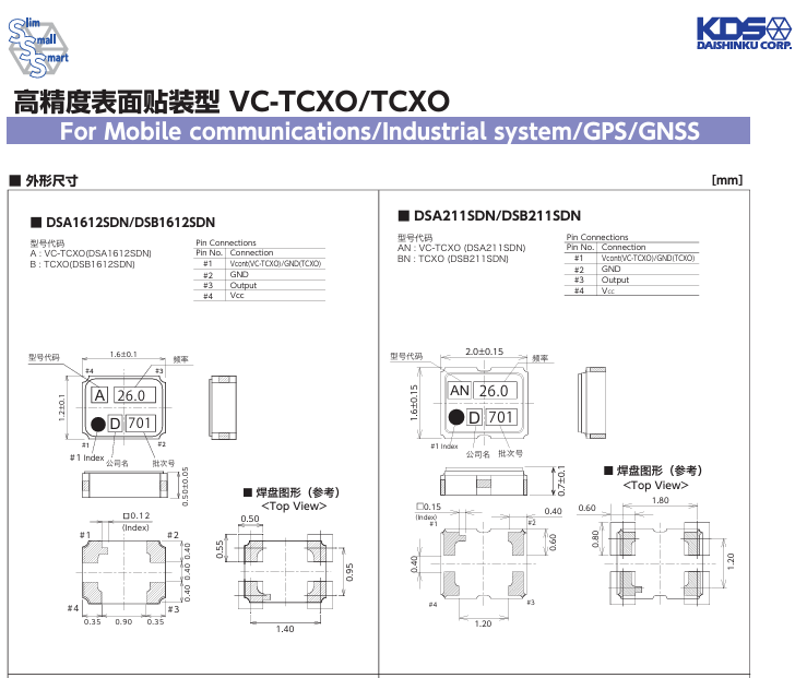 更多>>7EG02600A0S日本KDS小尺寸溫補(bǔ)晶振DSB1612SDN 26M TCXO