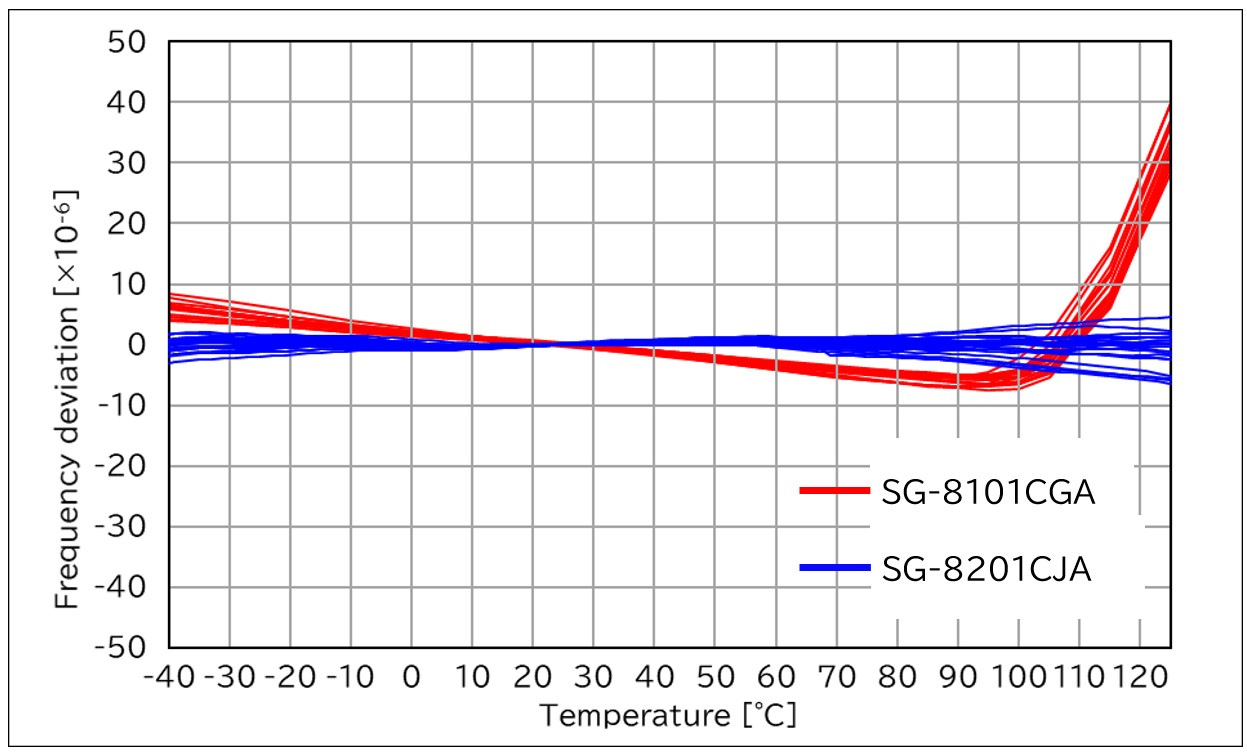 SG-8201CJA對(duì)汽車(chē)應(yīng)用的貢獻(xiàn)1通過(guò)溫度補(bǔ)償功能在寬溫度范圍內(nèi)實(shí)現(xiàn)高頻率穩(wěn)定性與現(xiàn)有的SPXO石英晶體振蕩器SG-8101CGA相比,該產(chǎn)品可將溫度變化調(diào)節(jié)至+125℃,在較寬的溫度范圍內(nèi)具有高穩(wěn)定性特性.SG-8201CJA即使在各種汽車(chē)應(yīng)用所需的惡劣溫度條件下(-40℃至+125℃)也能實(shí)現(xiàn)穩(wěn)定的頻率容差.■SG-8201CJA(±25x10-6/-40to+125℃)vsSG-8101CGA(±20x10-6/-40to+105℃).png)